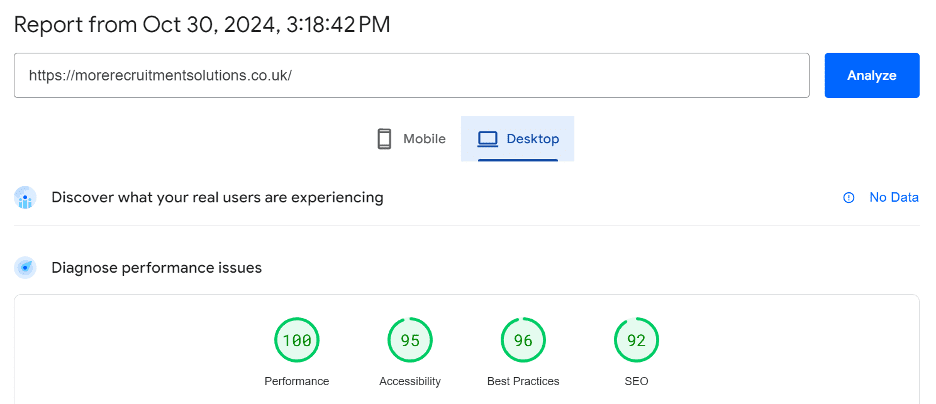 Results: Desktop homepage performance, accessibility, best practices and SEO are all 92/100 or higher.